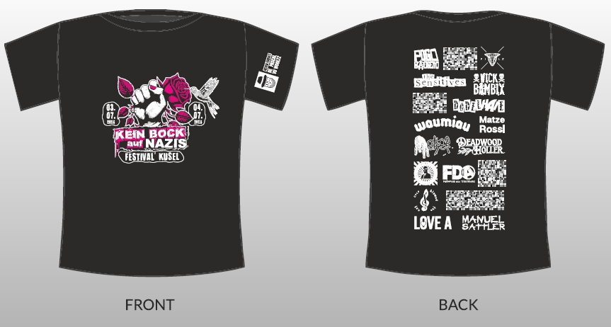 Die Bestellung der „Kein Bock auf Nazis“-Festival Shirts/Hoodies erfolgt dieses Jahr wieder ausschließlich über die Mailadresse info@kban-festival-kusel.de .