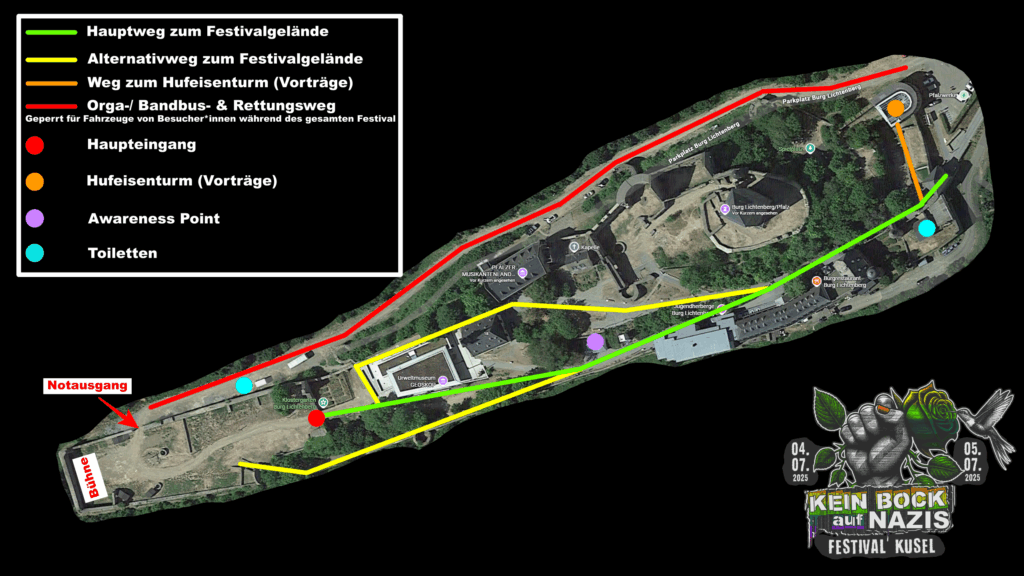 Weiterhin steht während des Festivals P4 als Parkmöglichkeit auf einer ebenen Wiese zur Verfügung. Der Fußweg bis zum Burggelände beträgt ca. 400 Meter und führt am Zeltplatz vorbei.